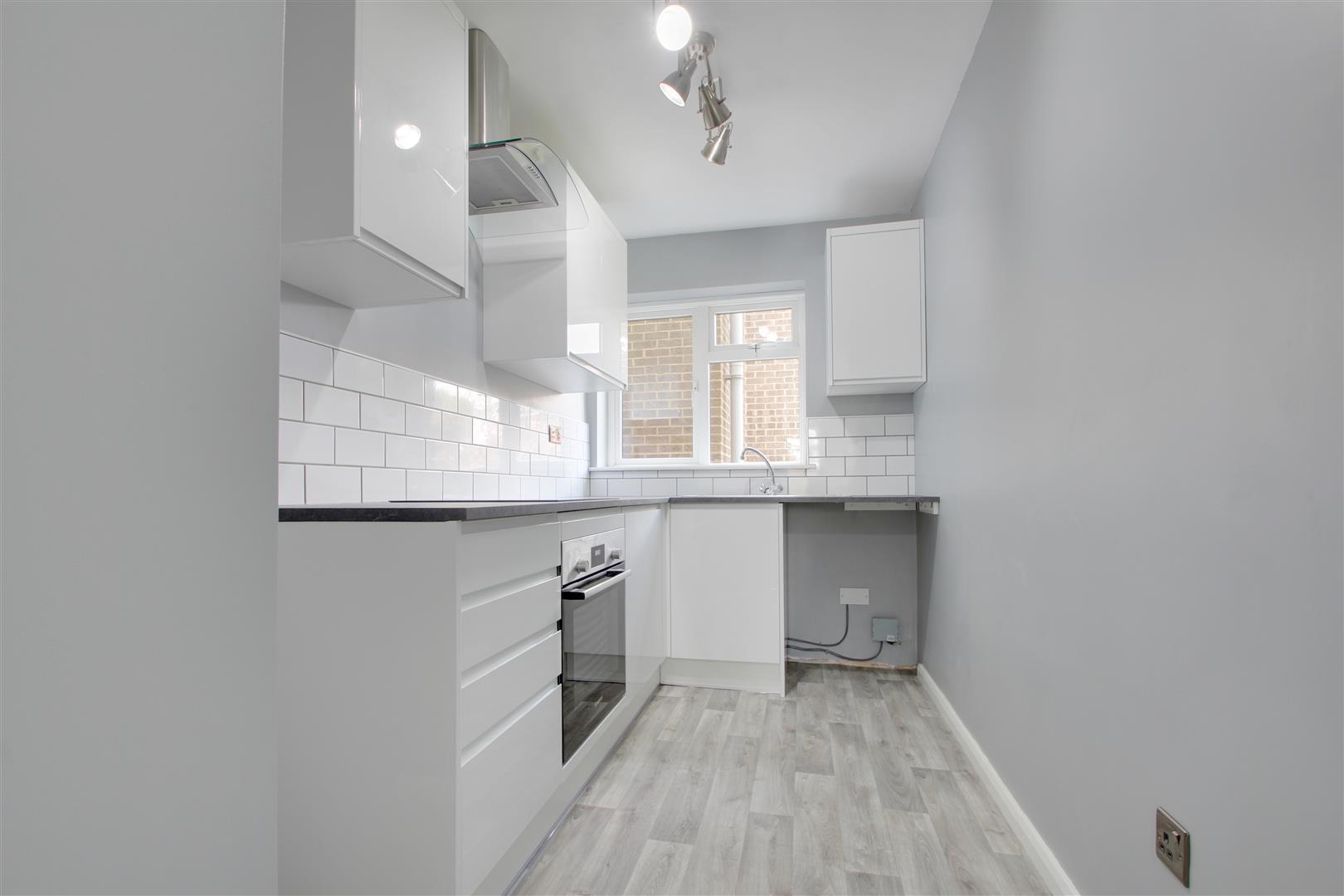 Newly fitted white high gloss kitchen with electric Zanussi oven and hob, space for fridge freezer and space and plumbing for washing machine