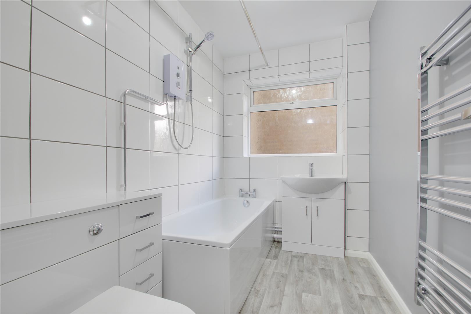 Newly fitted white bathroom suite with electric shower over bath, vanity storage around toilet and sink, heated towel rail
