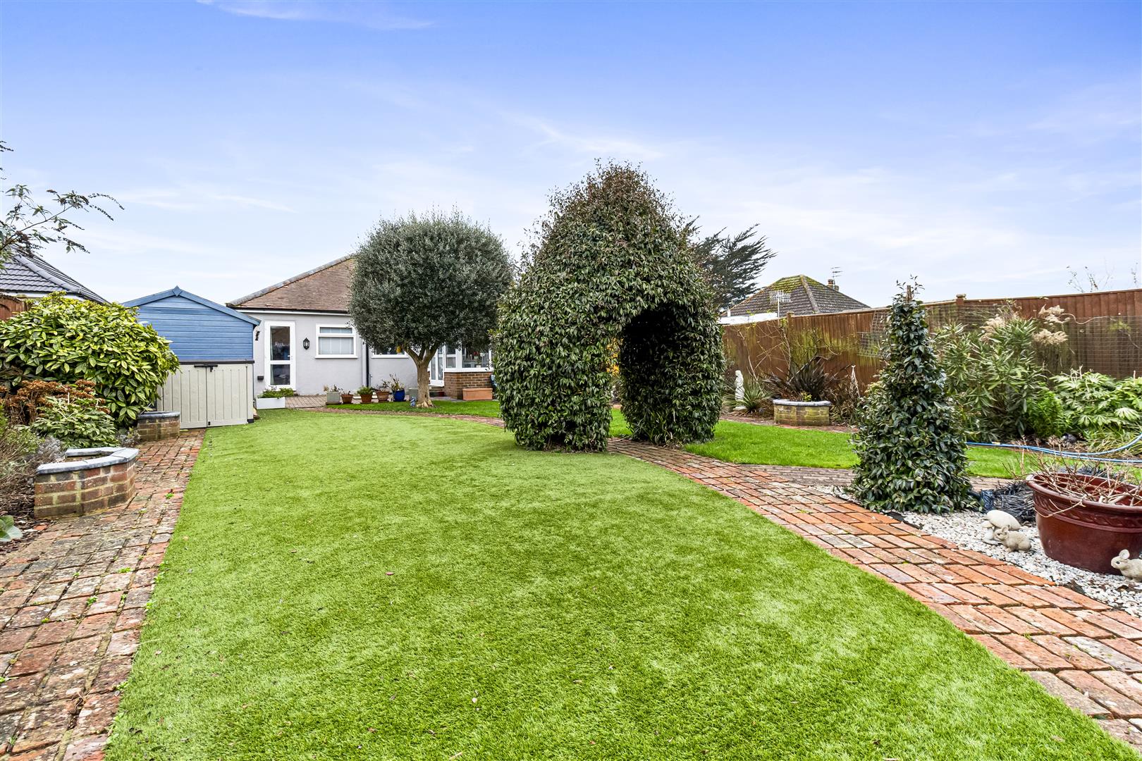 A beautifully presented and well extended detached bungalow in this popular residential area forming part of Ferring Village. In brief, the accommodation comprises enclosed entrance hall with floor to ceiling, storage cupboard, into double aspect bay fronted lounge with focal fireplace and living gas flame fire. There are two double aspect bedrooms with bedroom one having a bay window, and bedroom two giving access to the rear garden. There is a luxury fitted family bathroom with WC and wash hand basin inset to vanity unit. The kitchen is a particular feature of the property with an archway opening up to the conservatory with French doors opening onto the stunning rear garden. The front garden is arranged to provide off road parking, and the rear garden is half laid to artificial lawn, the other half is real lawn. There is brick block paving providing paved areas, and footpaths to the garden cabin which measures internally to 23 foot in length. There are also pleasing views towards Highdown. Other benefits include gas centre heating and double glazing. In our opinion, internal viewing is considered essential to appreciate the overall size and condition of this beautiful bungalow. Situated in Langbury Lane, local shops can be found nearby in Ferring Village which cater for everyday needs. Asda superstore is also close at hand. The nearest mainline railway station is Goring-by-Sea, which gives great links to most major towns and cities. Regular buses also serve the area. Please contact the vendors sole agents to arrange your private viewing tour.