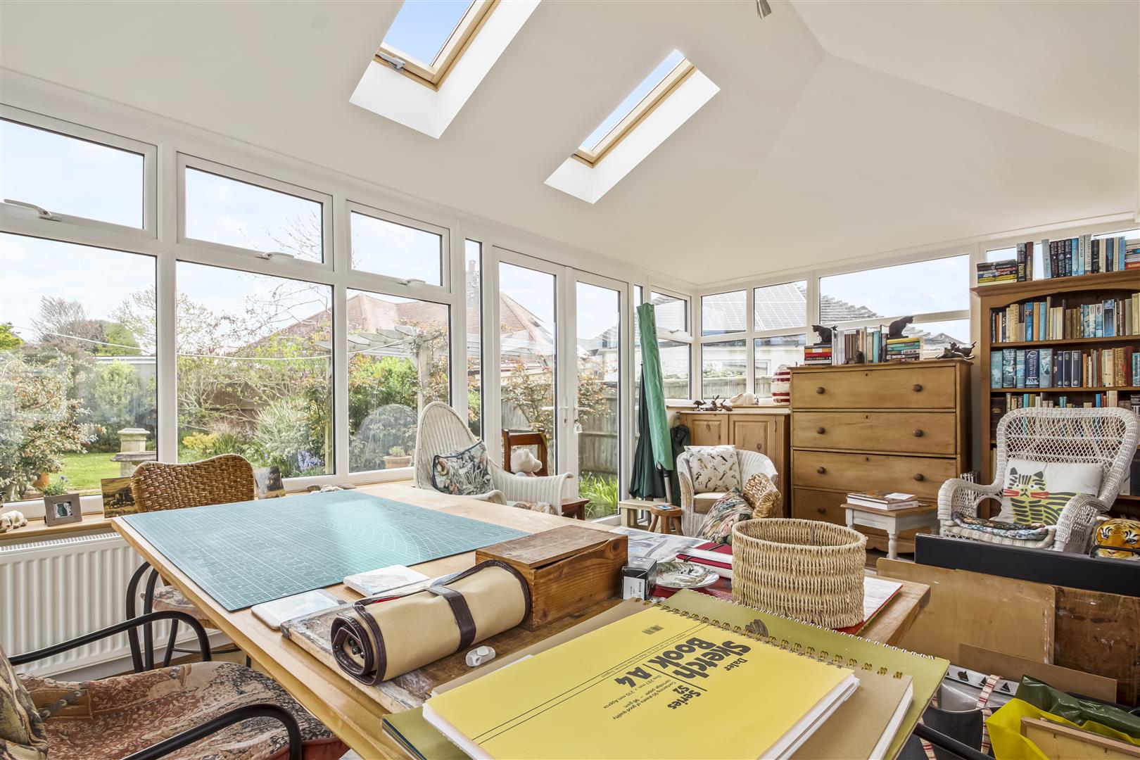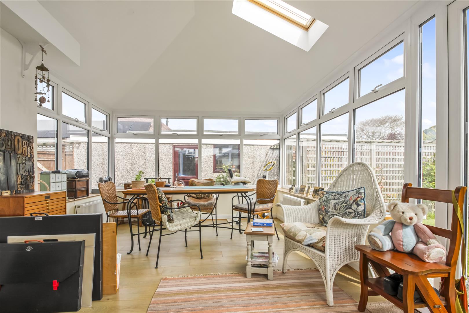 - Sun room with windows on three sides and direct access to the garden