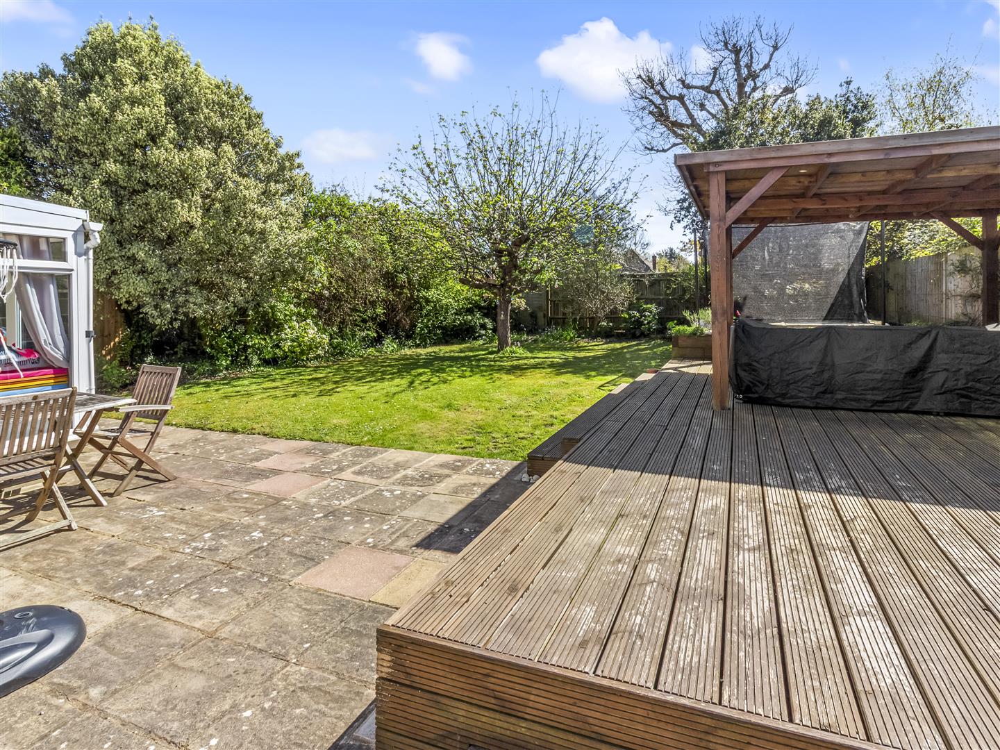 - Southerly aspect rear garden, mainly laid to lawn with patio and raised decking